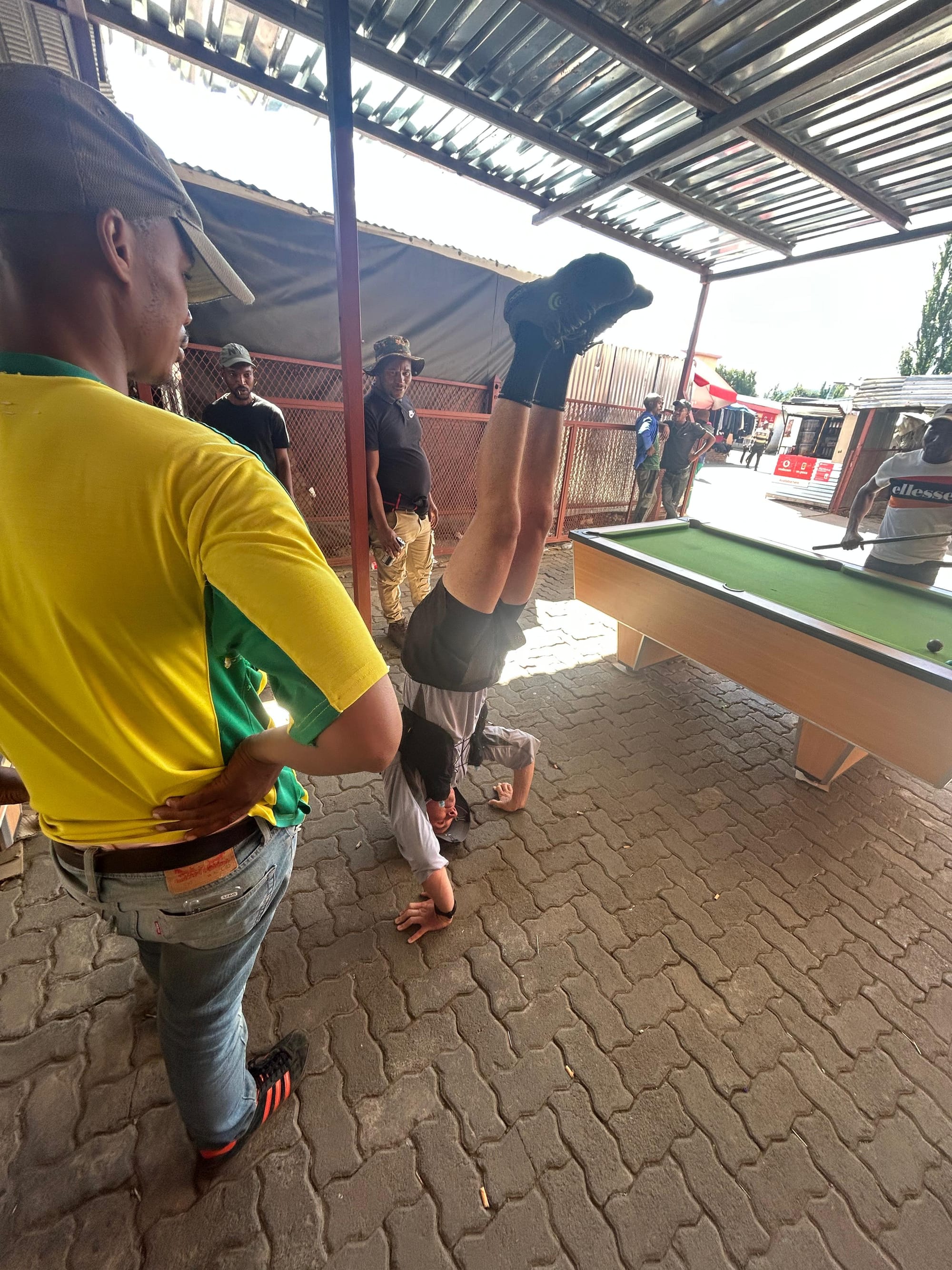 Doing a headstand and other physical feats with a local in Maseru at a pool bar while waiting for our taxi to Reconnect